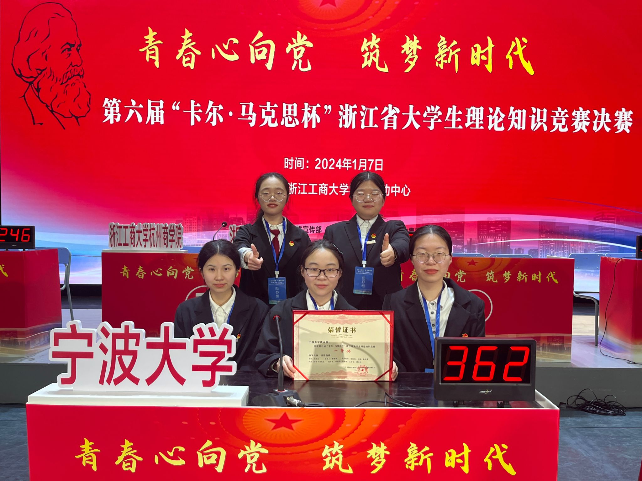 2024年1月7日,参赛一行人赴浙工商参加省赛决赛。决赛分共答题、抢答题、风险题、时政评论四个环节进行。比赛现场,团队分工合作、沉着应对,在风险题、时政评论环节均取得全场最高分,最终以367分的成绩获得一等奖。天美传媒