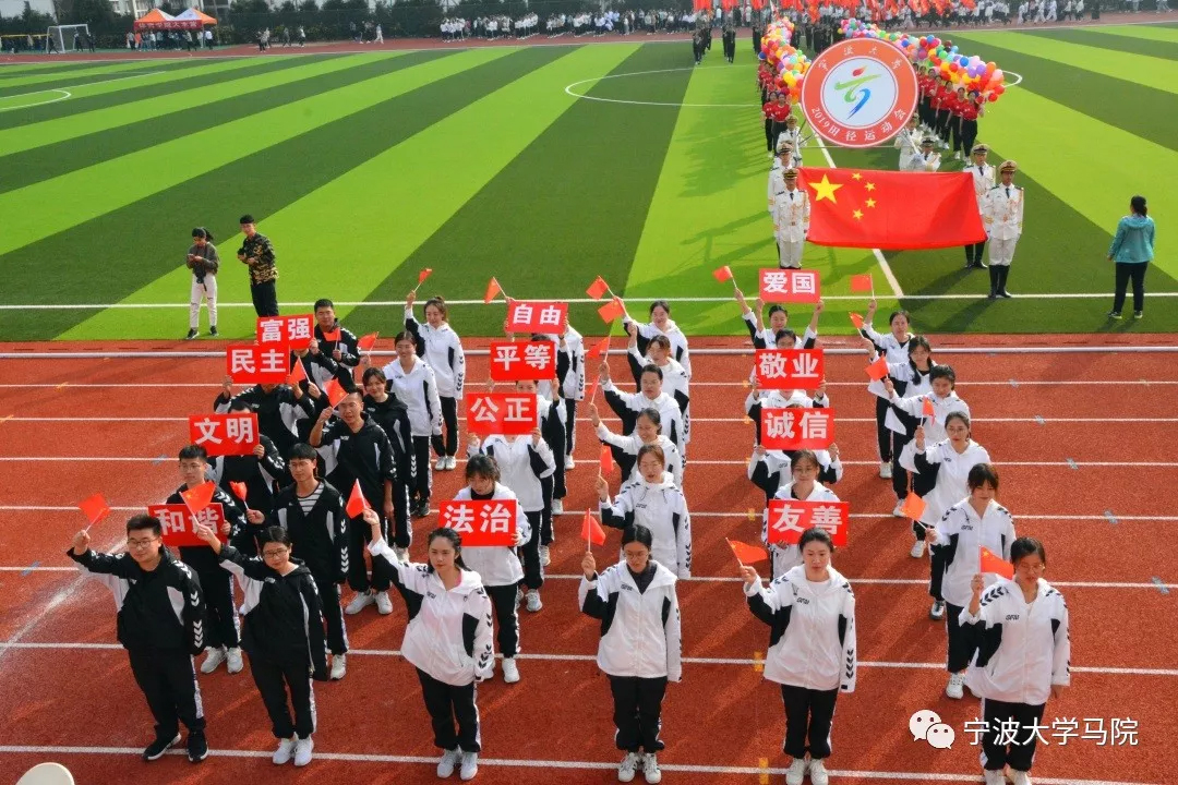 始终昂扬向上,砥砺前行!随后进行了学生表演以及各学院广播操示范,运动场上的马院学子衣着统一、干净利落。