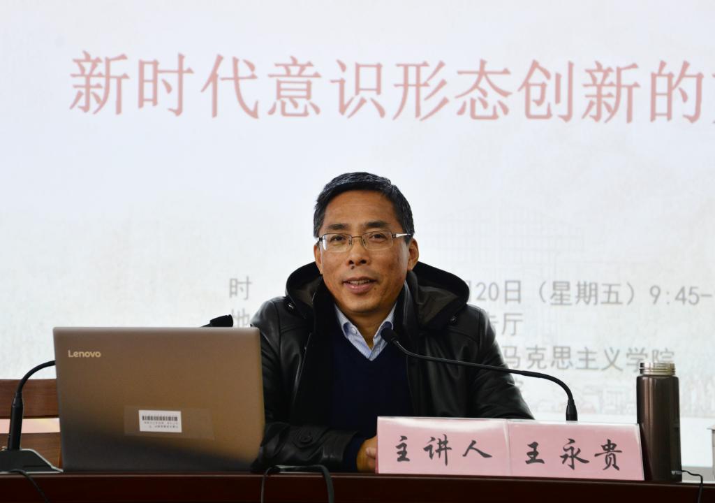 王永贵教授首先强调要科学把握意识形态内涵。他指出,意识形态是一个含义丰富的概念,具有积极的功能,从产生起便具有鲜明的阶级性特征。随后,王永贵教授讲解了新时代意识形态建设的创新逻辑。他提到,树立创新思维理念和富有创新精神是马克思主义发展的鲜明品格,也是社会主义意识形态不断彰显活力的重要特征。新时代,党的意识形态工作彰显了丰厚的创新意蕴,可以从思维方法、思想理论和实践开拓等维度上予以审视和把握。