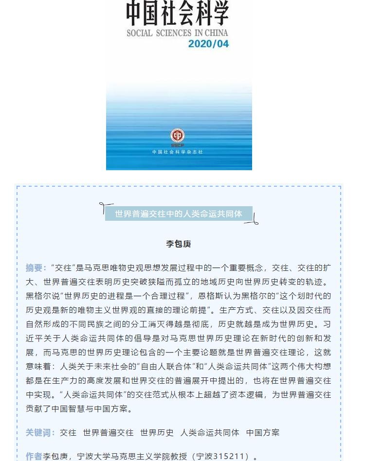 李包庚教授在人文社科权威期刊《中国社会科学》(2020年第4期)发表学术论文《世界普遍交往中的人类命运共同体》,这是天美传媒