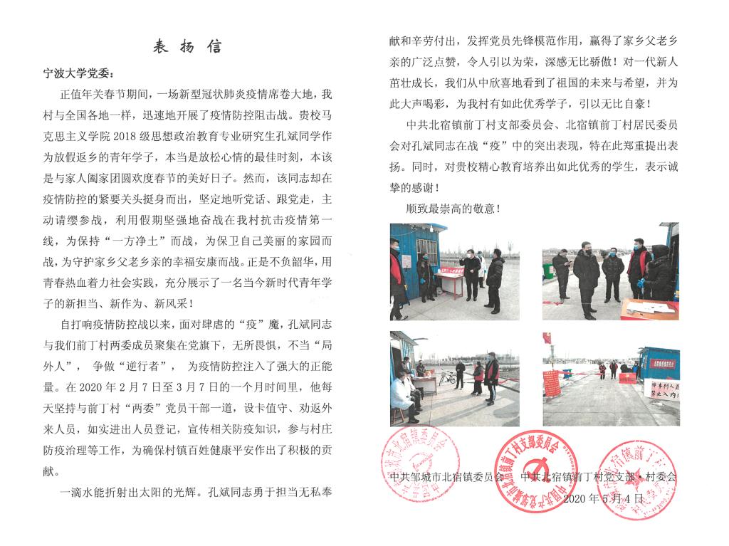 学子孔斌积极参与家乡志愿战“疫”工作表示了感谢,对其表现出来的勇于担当、无私奉献的优良品质表示赞赏。