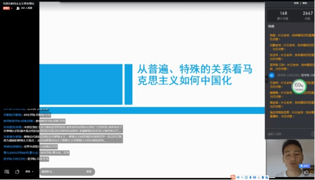 叶云博士主讲的课程为《毛泽东思想与中特理论概论》的“毛泽东新民主主义革命理论”一节。叶博士以历史事件为切入口,从理论高度阐释了马克思主义中国化发展的过程及其成果。课堂上,叶博士通过提问、互动讨论的方式以及形象生动的视频案例,就毛泽东如何把马克思主义的基本原理同中国的具体实际相结合进行了深入的剖析。叶博士教学语言流畅,讲解思路清晰,教学内容有理论深度,善于引发学生的思考。