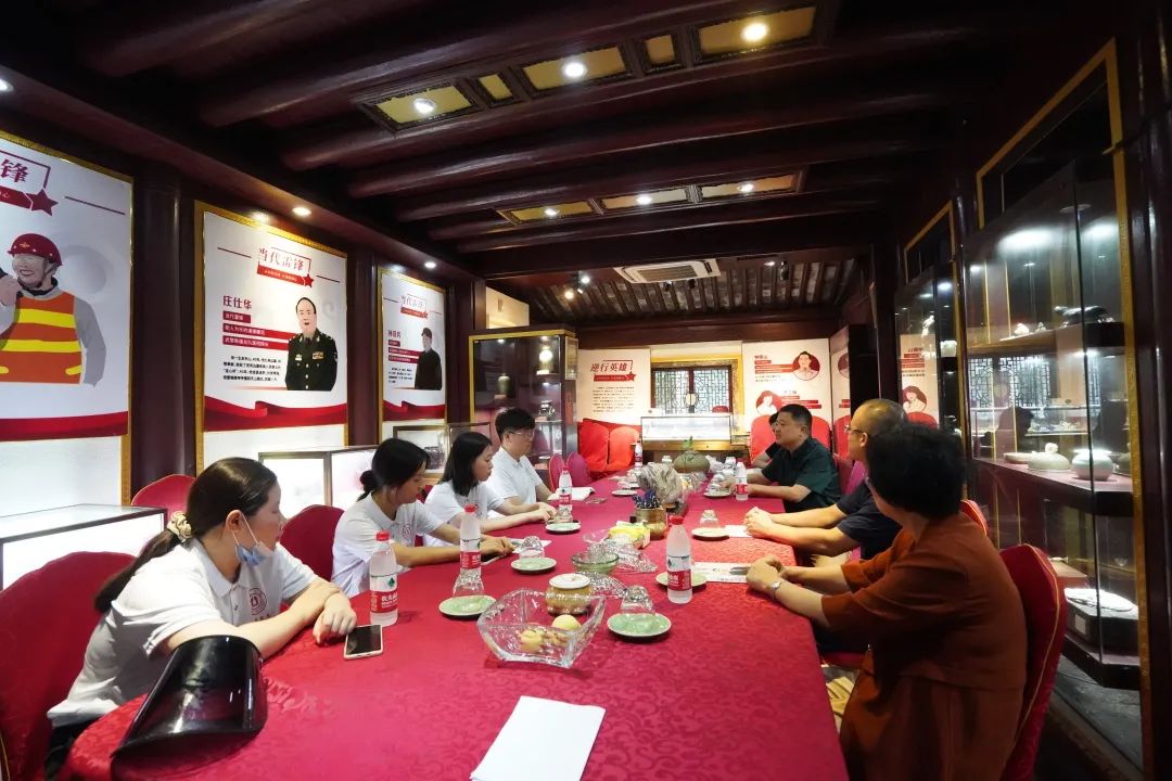 最令团队成员动容的,还是韩桂秋烈士舍身抗洪的故事。1956年8月1日,特大台风登陆象山。海浪冲垮了海塘堤坝,淹没了南庄平原。眼看人民生命财产遭受严重威胁,身为南庄抗台前线总指挥的韩桂秋毅然返回指挥部龙王庙。海啸发生,大庙将倾,韩桂秋不顾个人安危,用自己的身躯作人梯,竭尽全力抢救了30多位难民,然而自己却因连日奔波劳累精疲力竭,最终掉入水中,消失在汹涌的巨浪里,时年35岁。从韩向民女士的讲述中,同学们真切地感受到了韩桂秋烈士心系人民、顾全大局、恪尽职守的奉献精神。韩女士说,“作为韩桂秋烈士的后人,我有责任让父亲的精神代代相传。”前辈回眸应笑慰,擎旗自有后来人!这也是我们新时代年轻人应当铭记和传承的。