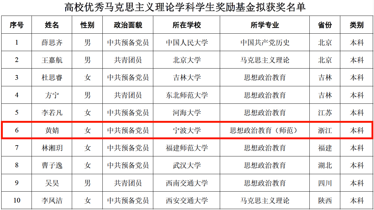 黄婧同学成为全国获得该奖项的10名本科生之一。