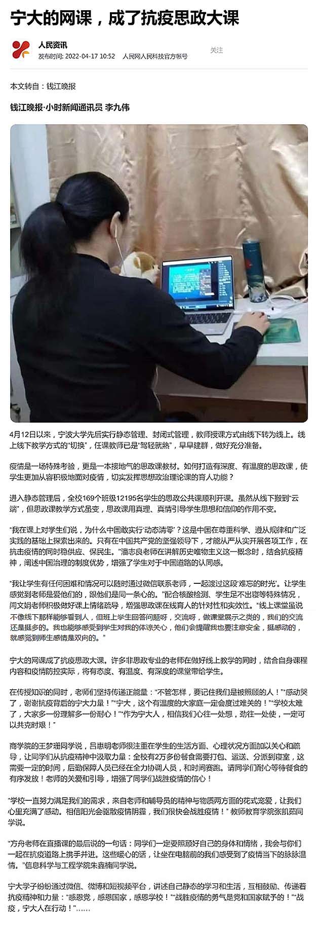如何打造有深度、有温度的思政课,使学生能够更加从容积极地面对疫情?天美传媒 如何切实发挥思想政治理论课的育人功能?4月17日的钱江晚报对天美传媒 抗疫思政云课堂作了报道……