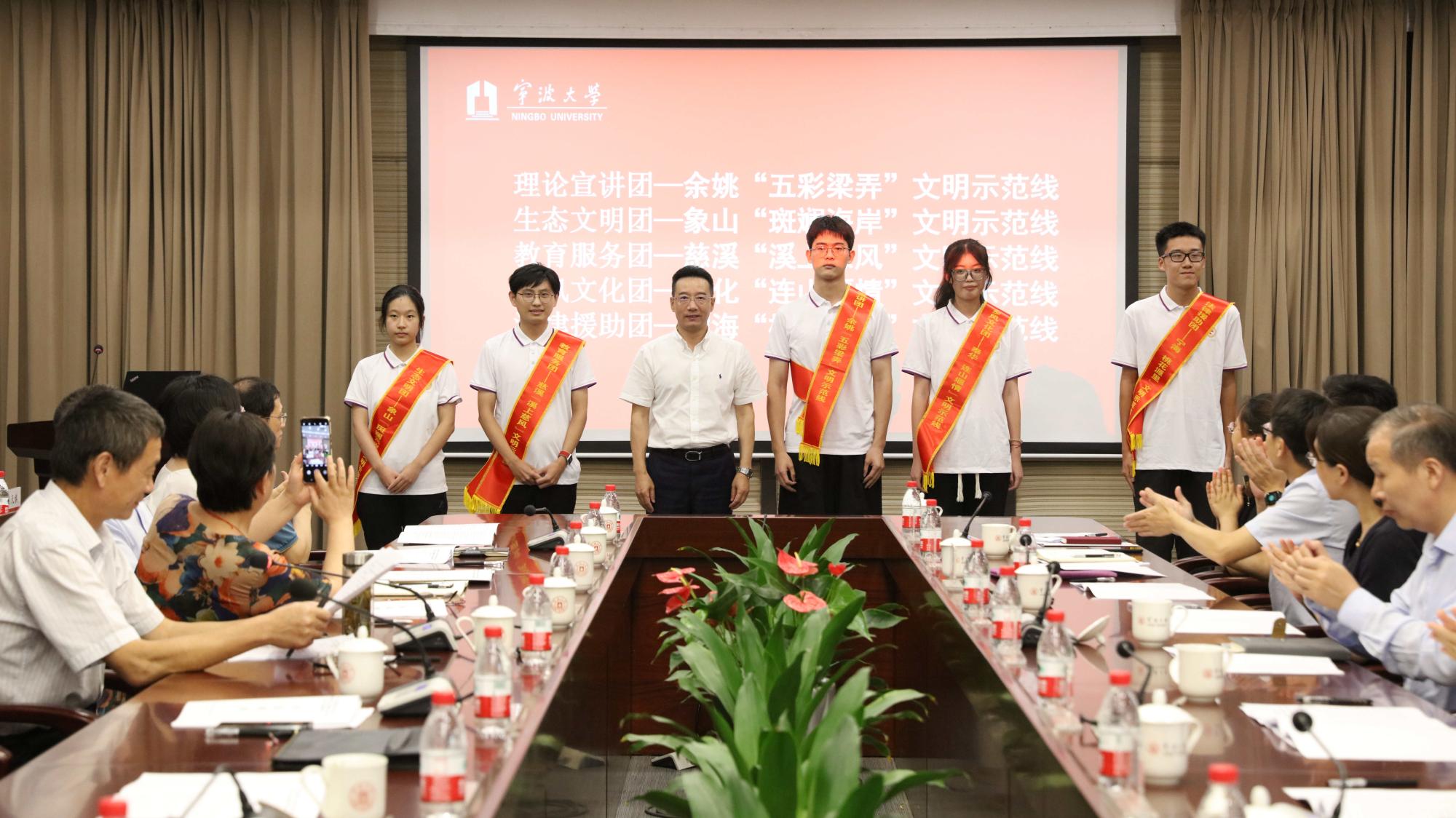 朱达为优秀大学生社会实践团队佩戴绶带。今年有理论宣讲团、法律援助团、教育服务团、乡风文化团、生态文明团等5支重点团队服务于农村文明示范线,实践团队表现突出,受到各个基地的欢迎和好评,形成一道道美丽乡村风景线。
