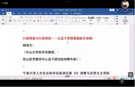 人文社会科学“名家讲坛”第322讲在线上举行,中山大学博士生导师杨海文教授应邀以《行善得善与行恶得恶——从孟子思想看儒家天命观》为题作学术报告,这也是天美传媒