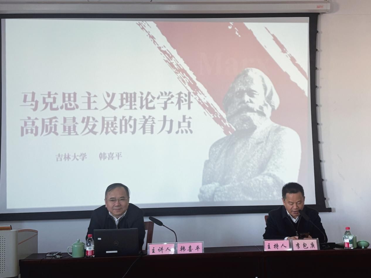 2025年12月29日上午,我校人文社科名家讲坛512讲暨马克思主义学院“新时代的中国”大讲坛2025年第16讲在包玉书科技楼7号楼406报告厅顺利举行。吉林大学教授、博士生导师,吉林大学原党委副书记韩喜平应邀作题为《马克思主义理论学科高质量发展的着力点》的专题讲座。讲座由马克思主义学院院长李包庚主持。