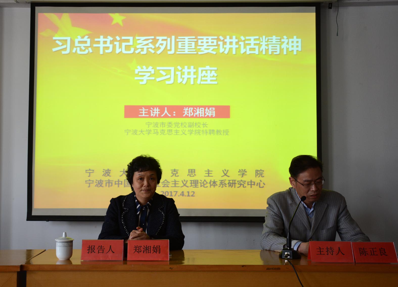 为深入推进马克思主义学院师生对习总书记十八大以来系列重要讲话的学习研究,4月12日下午,学院邀请了宁波市委党校副校长、宁大马克思主义学院特聘教授郑湘娟来院作“学习习近平总书记系列重要讲话精神”专题报告。院长陈正良主持了报告会。马克思主义学院全体师生参加了此次报告会。