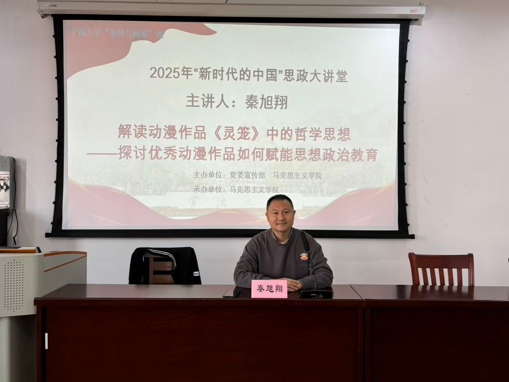 11月14日上午,宁波大学马克思主义学院教师秦旭翔为2023、2024级思想政治教育(师范)专业的本科生们带来了一节主题为“解读动漫作品《灵笼》中的哲学思想——探讨优秀动漫作品如何赋能思想政治教育”的形势与政策课。