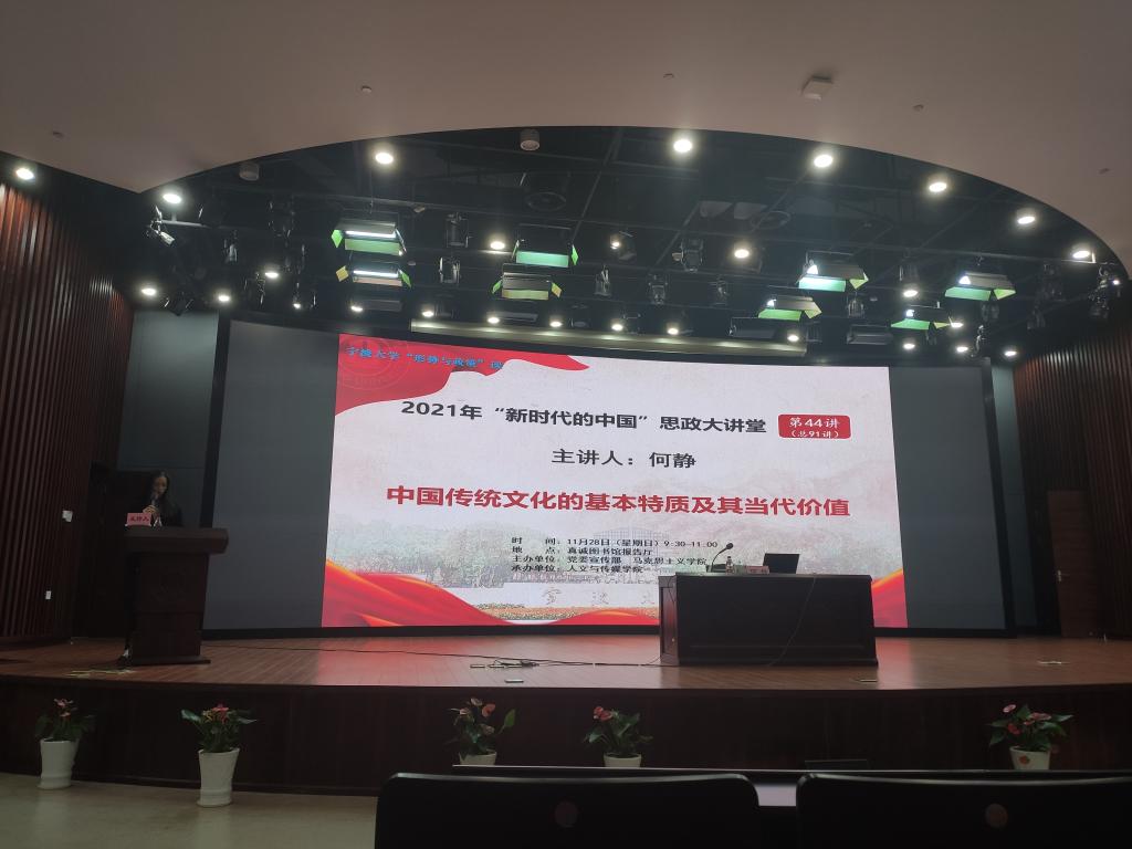 11月28日上午,马克思主义学院何静教授在宁波大学真诚图书馆报告厅为人文与传媒学院学生作题为《中国传统文化的基本特质及其当代价值》的形势政策课。