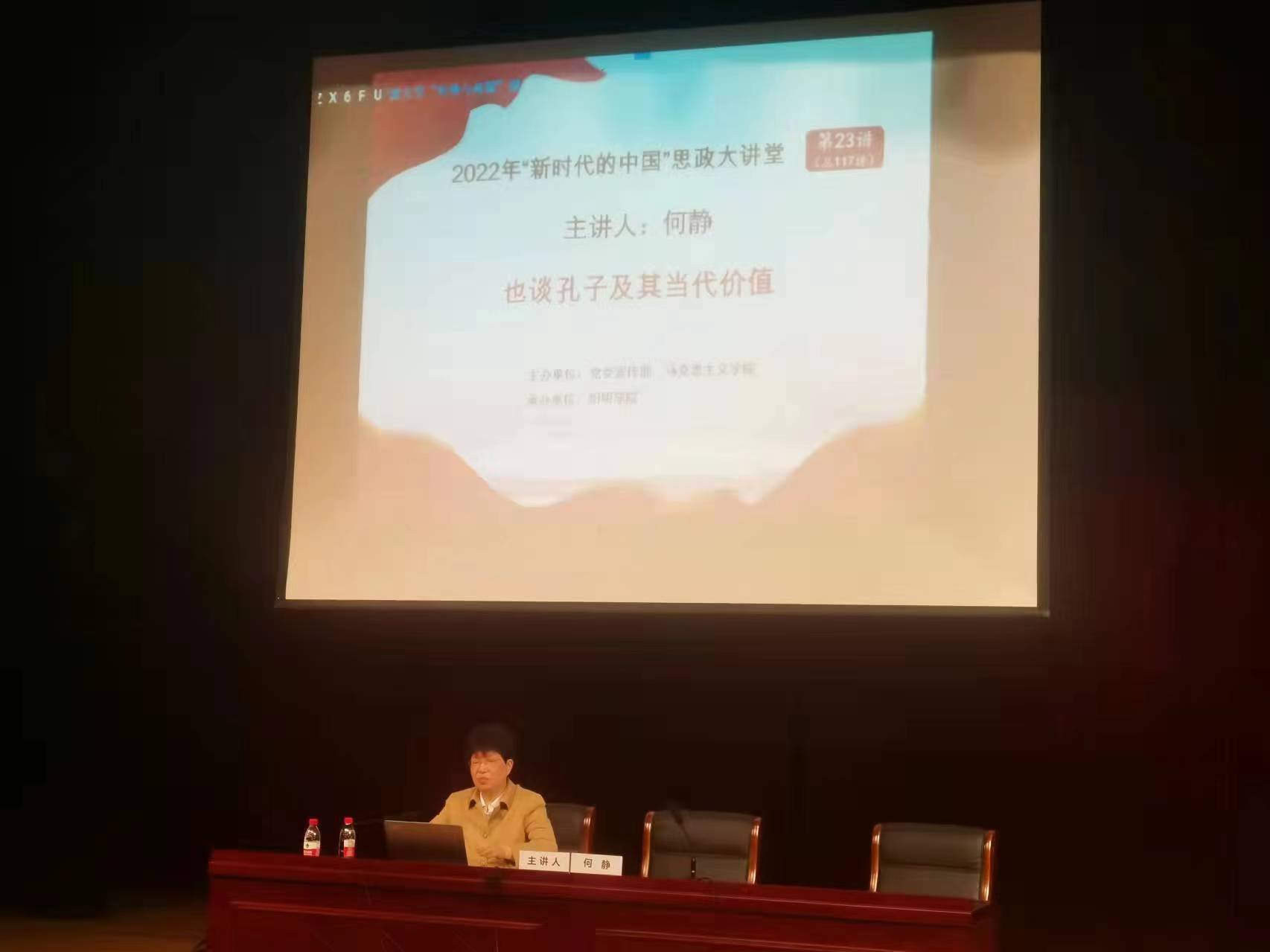 6月1日晚,马克思主义学院何静教授在宁波大学北区忻元甫报告厅为阳明学院学生作题为《也谈孔子及其当代价值》的“形势与政策”课。