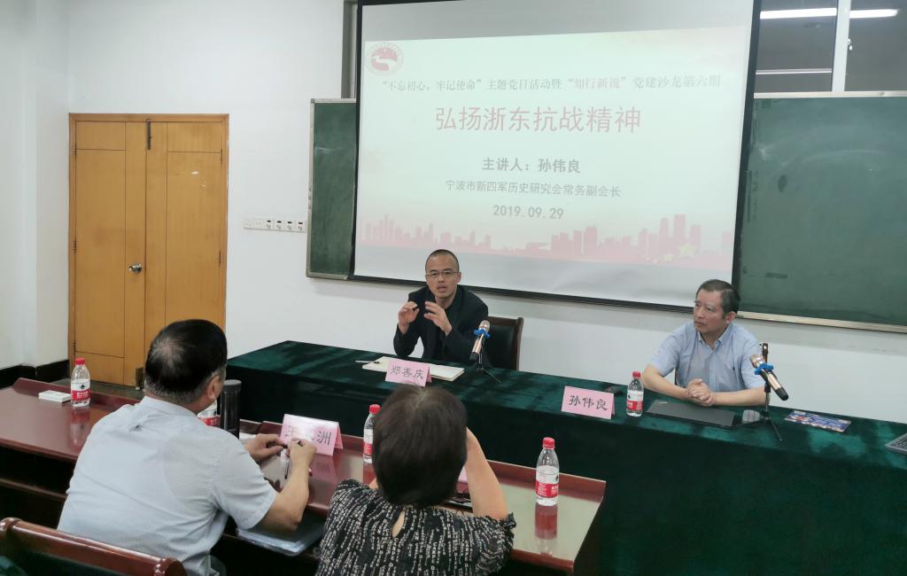 在新中国成立70周年之际,为进一步加强学生党员的爱国情怀与责任意识,9月29日上午,马克思主义学院在包玉书科技楼11号楼102室举办了“不忘初心,牢记使命”主题党日活动。宁波市新四军历史研究会常务副会长孙伟良应邀作《弘扬浙东抗战精神》主题讲座。活动由学院郑善庆副教授主持。