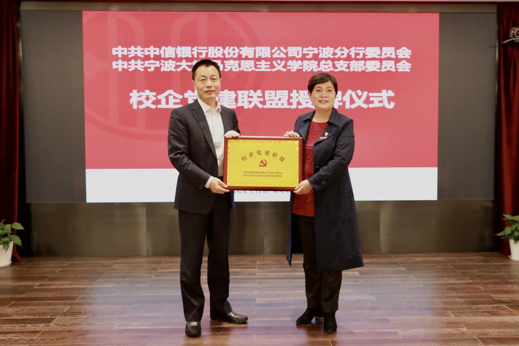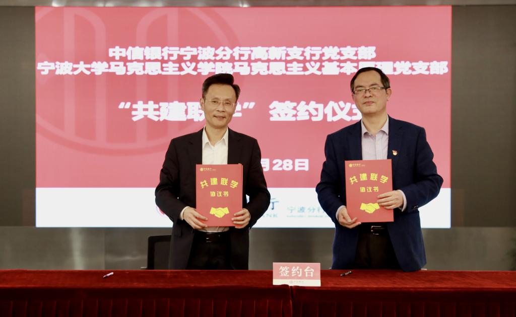 为深入开展党史学习教育,激发高校基层党建工作活力,探索校企党建共建融合式发展新模式,宁波大学马克思主义学院党总支与中信银行宁波分行决定建立校企党建联盟。4月28日,在中信银行宁波分行会议室,学院党总支与中信银行宁波分行机关党委共建签约,校企双方负责人为党建联盟授牌。同时,行政党支部、马克思主义基本原理党支部、马克思主义中国化研究党支部、思想政治教育党支部、国外马克思主义研究党支部分别与党群工作党支部、高新支行党支部、财务会计党支部、人力资源党支部、零售银行党支部等5个党支部签署“共建联学”二级协议。中信银行宁波分行党委委员、纪委书记、机关党委书记王立民、党委宣传部部长姚小荣出席了会议。