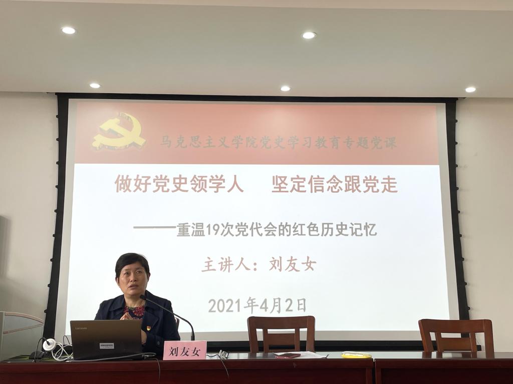 4月2日上午,马克思主义学院党史学习教育专题党课在7号楼406报告厅顺利开展。院党总支书记刘友女作题为《“做好党史领学人 坚定信念跟党走”——重温19次党代会的红色记忆》的专题党课,带领同学们重温建党的百年峥嵘历程。全院入党积极分子、发展对象、预备党员以及部分正式党员参加了此次党课学习。