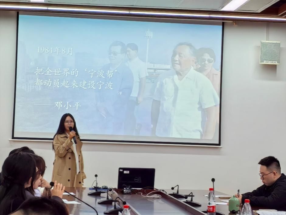 在“宁大岁月·荣光讲述”理论学习环节上,党支部特邀“初心”宣讲团成员高奕同学进行了题为《心系家国,薪火商帮谱写宁大风华》的宣讲。高奕同学深情回顾了宁波帮与宁大双向奔赴、携手拼搏的峥嵘岁月,滚滚甬江水不断向前翻腾,绵绵桑梓情也代代驰骋不息,站在这片“宁波帮”精神厚植的土地上,甬畔青年也当接续奋斗,奔涌向前,谱写崭新的宁大风华!点燃了在场所有人的奋斗激情!