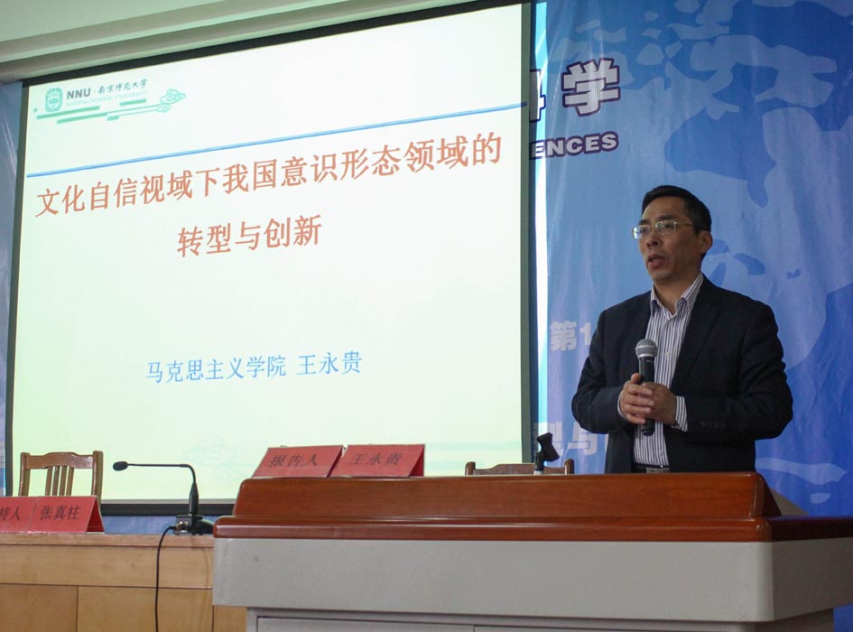“人文社会科学名家讲坛”第155讲在包玉书科学楼10号楼209室举行。享受国务院政府特殊津贴专家、南京师范大学博士生导师王永贵教授应邀作题为《文化自信视域下我国意识形态的转型与创新》的报告。校党委委员、宣传部部长张真柱主持了报告会。天美传媒