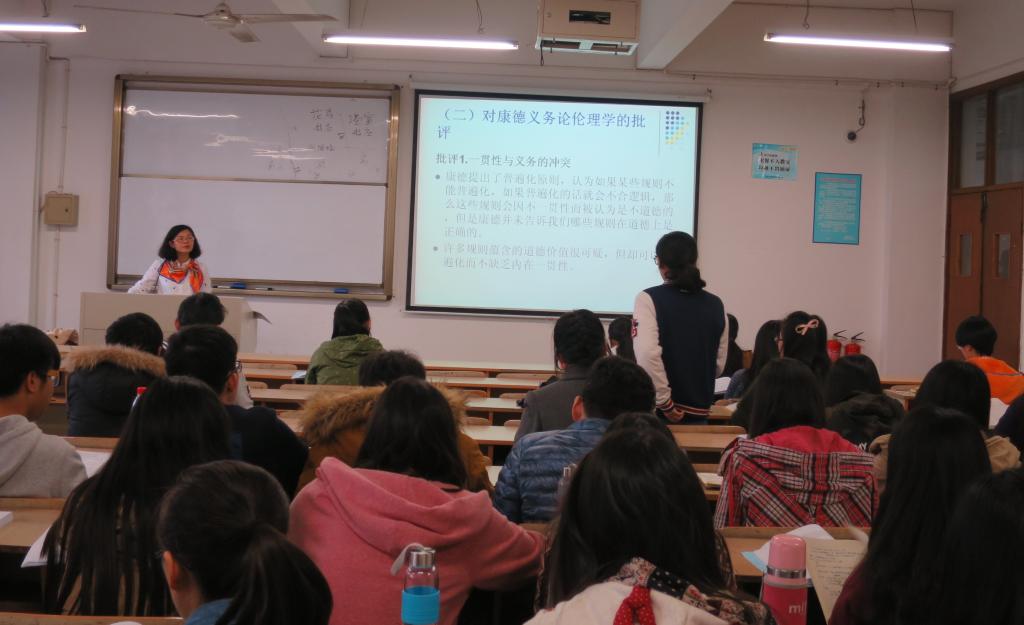 11月12日下午,天美传媒 本学期第一期院级公开教学观摩活动在6号楼314教室开展,本次公开课由曲蓉副教授主讲,主讲课程为《伦理学》,从“对康德义务论伦理学的批评”、“罗斯的显见义务论”、“对非结果论的批评”三个方面进行了详细的讲解和阐述。曲蓉老师的课程教学内容详实且有理论深度,案例丰富便于理解,通过知识点的回顾,增加与学生之间的互动。