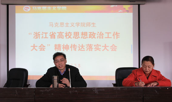 陈正良院长首先传达了省委书记夏宝龙在全省高校思想政治工作会议上的重要讲话精神:要认真学习贯彻习近平总书记系列重要讲话精神和治国理政新理念新思想新战略,坚持社会主义办学方向,强化“四个服务”意识,把立德树人作为高校立身之本,进一步做好我省高校工作特别是思想政治工作,加快建设高等教育强省。强调高校“十要”。一要使中国特色社会主义成为我省高校最鲜亮的底色;二要把社会主义核心价值观贯穿于高校办学育人全过程;三要上好思想政治理论课;四要建好用好管好高校教师队伍;五要推进“双一流”建设;六要把服务省委中心工作贯穿于办学治校的全过程、各方面;七要进一步优化学科专业设置;八要进一步打开高校科研成果转化的通道;九要切实加强校园治理;十要进一步巩固党在高校的执政根基。