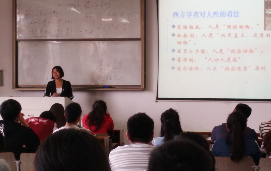本次公开课由康洁老师主讲,主讲课程为《思想道德修养与法律基础》。康洁的讲课内容是“领悟人生真谛,创造人生价值”部分。课程内容主讲之前,康洁首先让同学上台阐述关于价值观的思考。这是上节课布置的一项课后作业,由几位学生合作完成一个与课堂内容相关的话题,形成PPT后下节课上台阐述自己的观点。简短的点评后,康洁把话题引入到课堂主题:如何领悟人生真谛,创造人生价值?围绕人、人生与人生观,康洁由浅入深、层层递进,从中国古代关于人性善恶的争论以及西方学者对人性的看法从而引出马克思主义关于人性的观点:“人性是人的社会属性和自然属性的统一,二者既不能割裂,又不能等同。” 通过丰富的PPT内容展示,并与学生互动交流,康洁进一步深入阐释了马克思主义关于人的本质的论述:“人的本质是现实的、具体的;人的本质是由社会关系决定的;一切社会关系的‘总和’是诸多社会关系的有机统一;人的本质是历史的、发展的;人的自然属性是人的社会属性的物质承担者,但不是人的本质属性。”