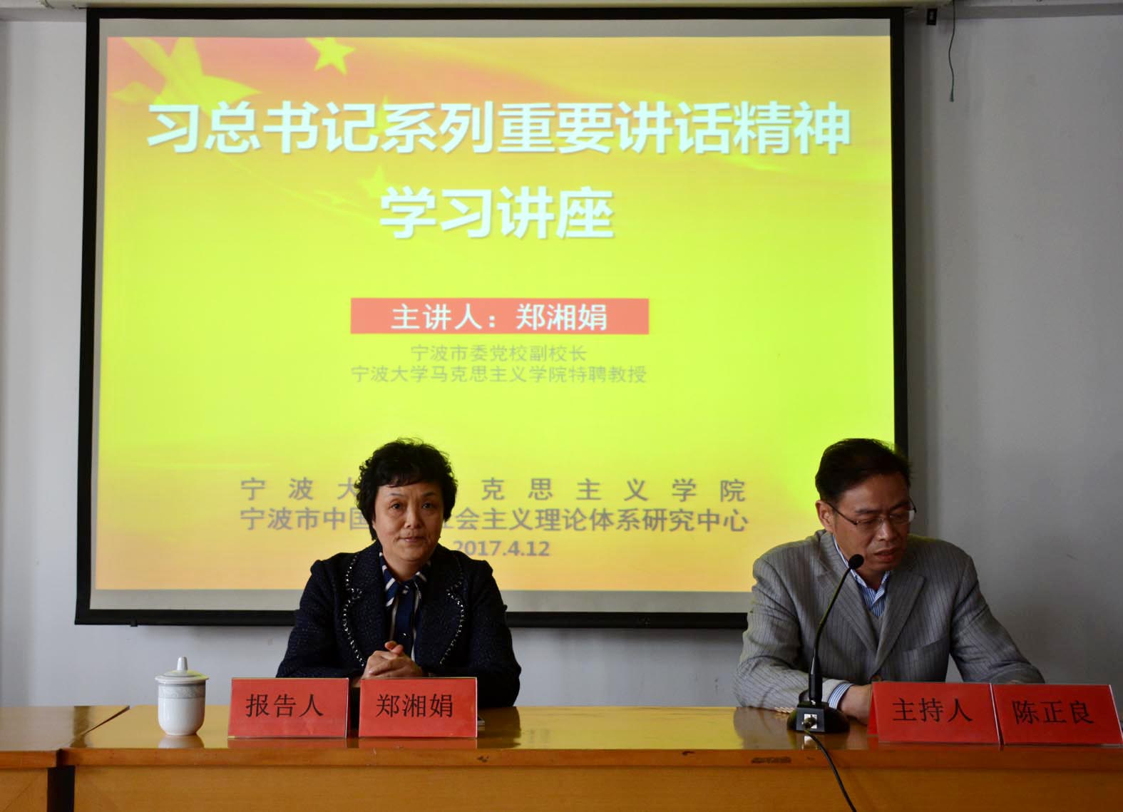 特聘教授郑湘娟为马院学子作“学习习近平总书记系列重要讲话精神”形势与政策报告。郑湘娟围绕习总书记治国理政思想的总体框架,从其核心理念 、根本主题、奋斗目标、基本思路、战略布局五个方面,对习总书记系列重要讲话精神作了深入解读。郑湘娟的报告逻辑清晰、层层递进、深入浅出,使在场师生充分认识了习总书记讲话的重大意义。