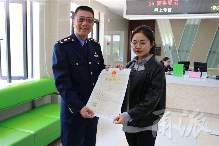 研二学生刘祯琪从宁波市江北区市场监管局局长任剑峰手中接过营业执照,其作为法定代表人的宁波卓思文化传播有限公司很幸运地成为江北区第5万户商事主体。刘祯琪同学作为企业法人代表接受了江北广播电视台和江北日报的采访。