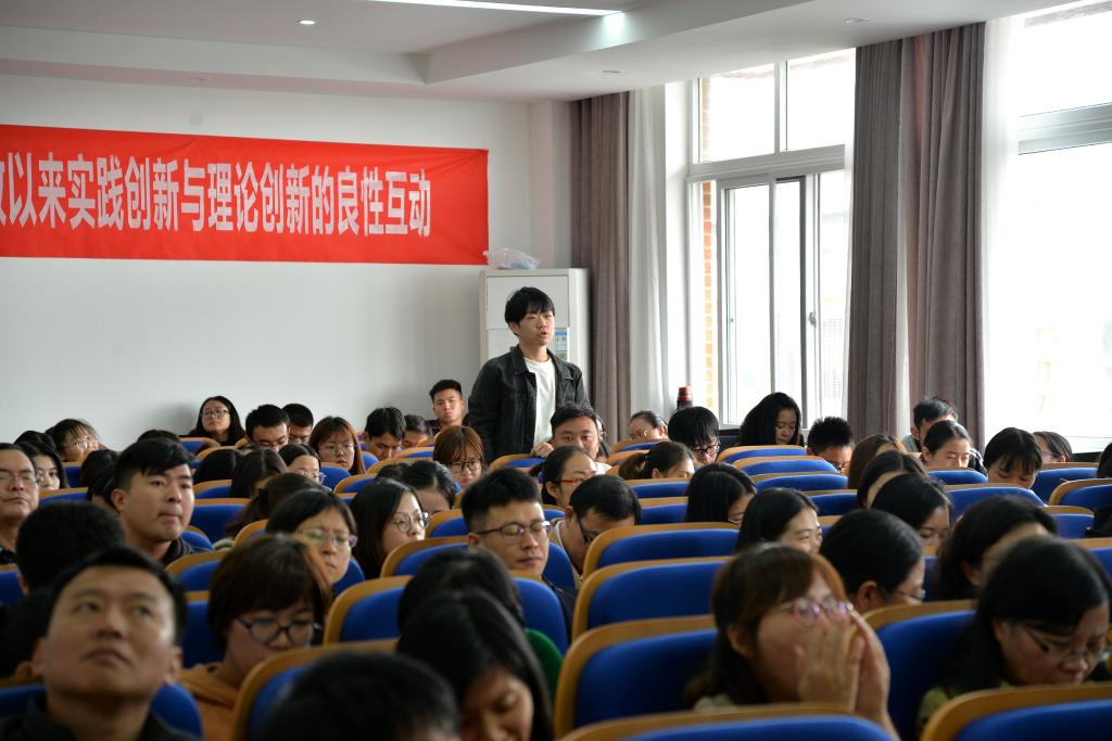 郝立新教授从“中国特色社会主义实践创新是理论创新的基础”、“科学理论的实践性和与时俱进品格构成马克思主义理论能够不断创新的内在依据”、“创新主体的科学态度、实践精神和创新思维是实现理论创新的主观条件”三个方面,阐述了改革开放以来实践创新和理论创新的良性互动及其规律,同时指出实践创新和理论创新的良性互动取决于三大因素:改革开放实践的内在品质、马克思主义理论的实践性和与时俱进品格及创新主体的科学态度、创新思维和实践精神。郝教授强调,中国特色社会主义理论创新和实践创新的主体是人民群众、是理论工作者、是中国共产党人。讲座中,郝教授对习近平新时代中国特色社会主义思想的主题和逻辑作了深刻阐析。深入浅出的讲解,使在场师生对改革开放以来中国特色社会主义的伟大实践和中国特色社会主义理论的形成发展及其两者的良性互动规律有了更深的了解,深受启发和鼓舞。
