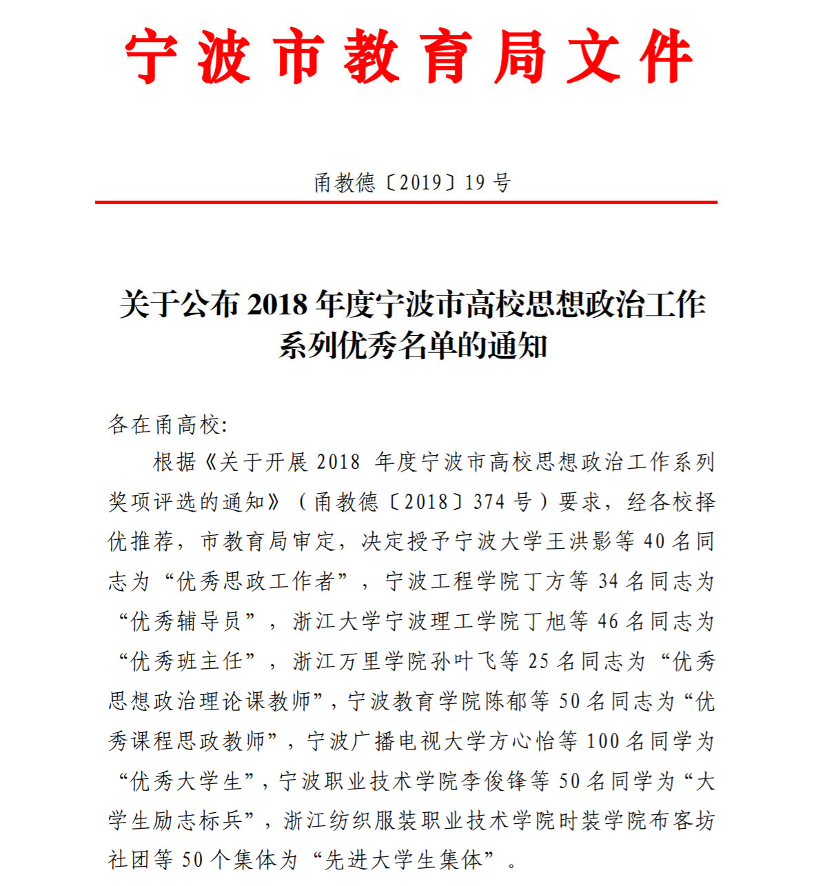 近日,2018年度宁波市高校思想政治工作系列优秀名单公布。其中,天美传媒 邹建锋、陈正良、薛秀霞、彭传华4位老师被评为2018年度宁波市高校 “优秀思想政治理论课教师”。