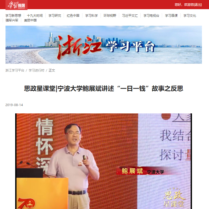 为认真贯彻落实习近平总书记在学校思想政治理论课教师座谈会上的重要讲话精神,中共浙江省委宣传部、中共浙江省委网信办、浙江省教育厅联合策划推出“思政星课堂”——我最喜爱的思政课老师推介宣传活动,着力推介一批思想性、理论性和亲和力、针对性强的优秀思政课,宣传一批政治强、情怀深、思维新、视野广、自律严、人格正的思政课老师,给学生心灵埋下真善美的种子,引导学生扣好人生第一粒扣子。 本期思政星课堂主讲人鲍展斌通过分享北宋太平兴国年间崇阳县令张乖崖严惩衙役盗窃一枚铜钱,使得社会风气大大好转的故事来揭示了量变引起质变的真谛。“祸患常积于忽微,蠹众而木折,隙大而墙坏”,一日一钱,千日千钱,绳锯木断,水滴石穿,我们必须防微杜渐、抓早抓小。