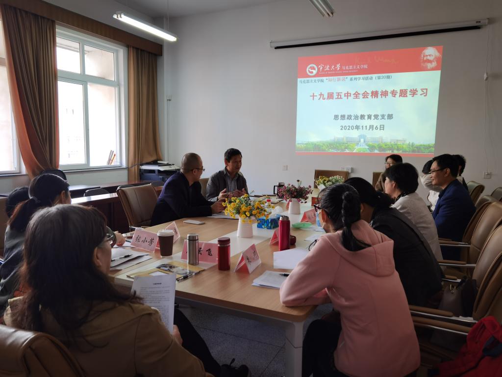 中国共产党第十九届中央委员会第五次全体会议,于2020年10月26日至29日在北京举行。党的十九届五中全会在全面建成小康社会胜利在望、全面建设社会主义现代化国家新征程即将开启的重要历史时刻召开,审议通过的《中共中央关于制定国民经济和社会发展第十四个五年规划和二〇三五年远景目标的建议》,深刻指明了今后一个时期我国发展的指导方针、目标任务、战略举措,充分体现了以习近平同志为核心的党中央谋划未来的远见卓识和继往开来的历史担当。马克思主义思想政治教育党支部齐聚一堂,气氛热烈,围绕十九届五中全会精神进行专题学习,党员们将十九届五中全会精神和思想政治课教师的使命和作用相结合,就如何把会议精神渗透到思想政治课课程教学中,如何进一步深化思想政治课教学改革各抒己见,展开了热烈的讨论。