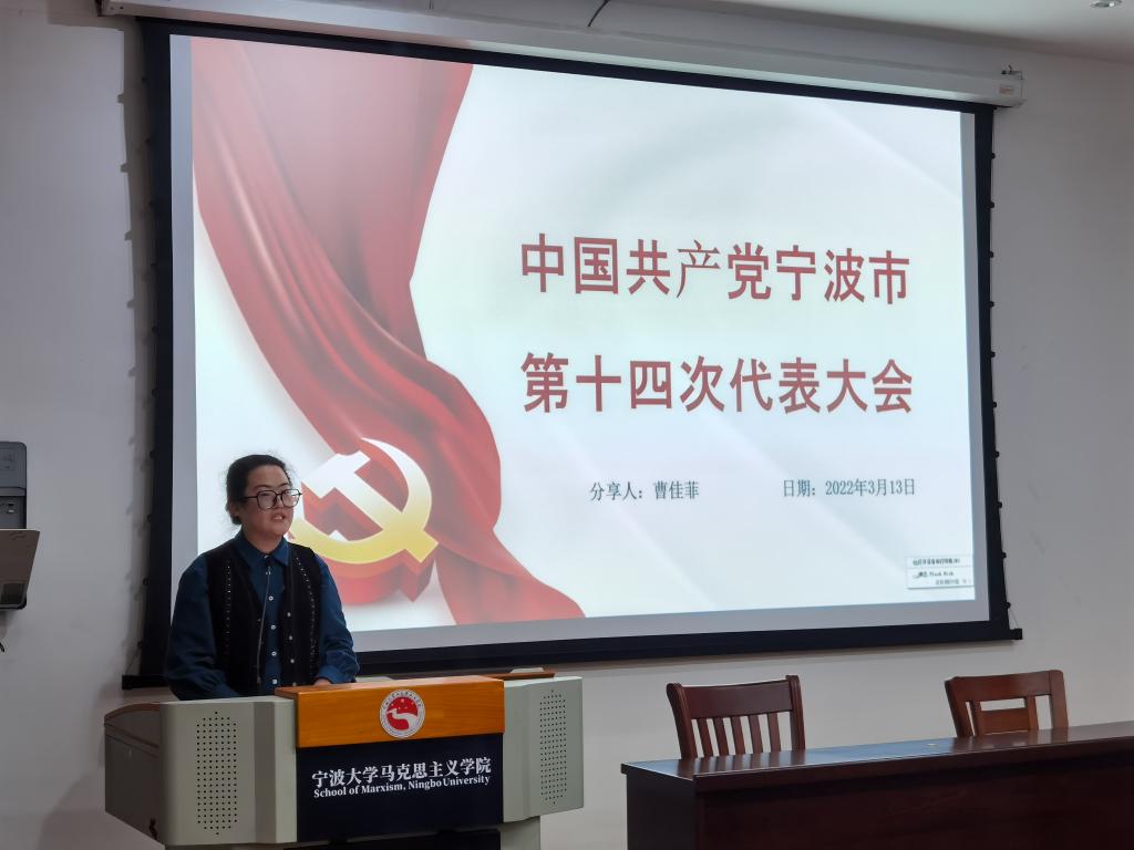 为树立学生榜样,发挥模范力量,同时更好学习宁波市第十四次党代会精神,3月13日晚,作为本次市党代会唯一学生代表,我院2020级研究生曹佳菲在7号楼406会议室为全院学生党员上了一堂别开生面的党课。院党总支书记刘友女出席了党课。
