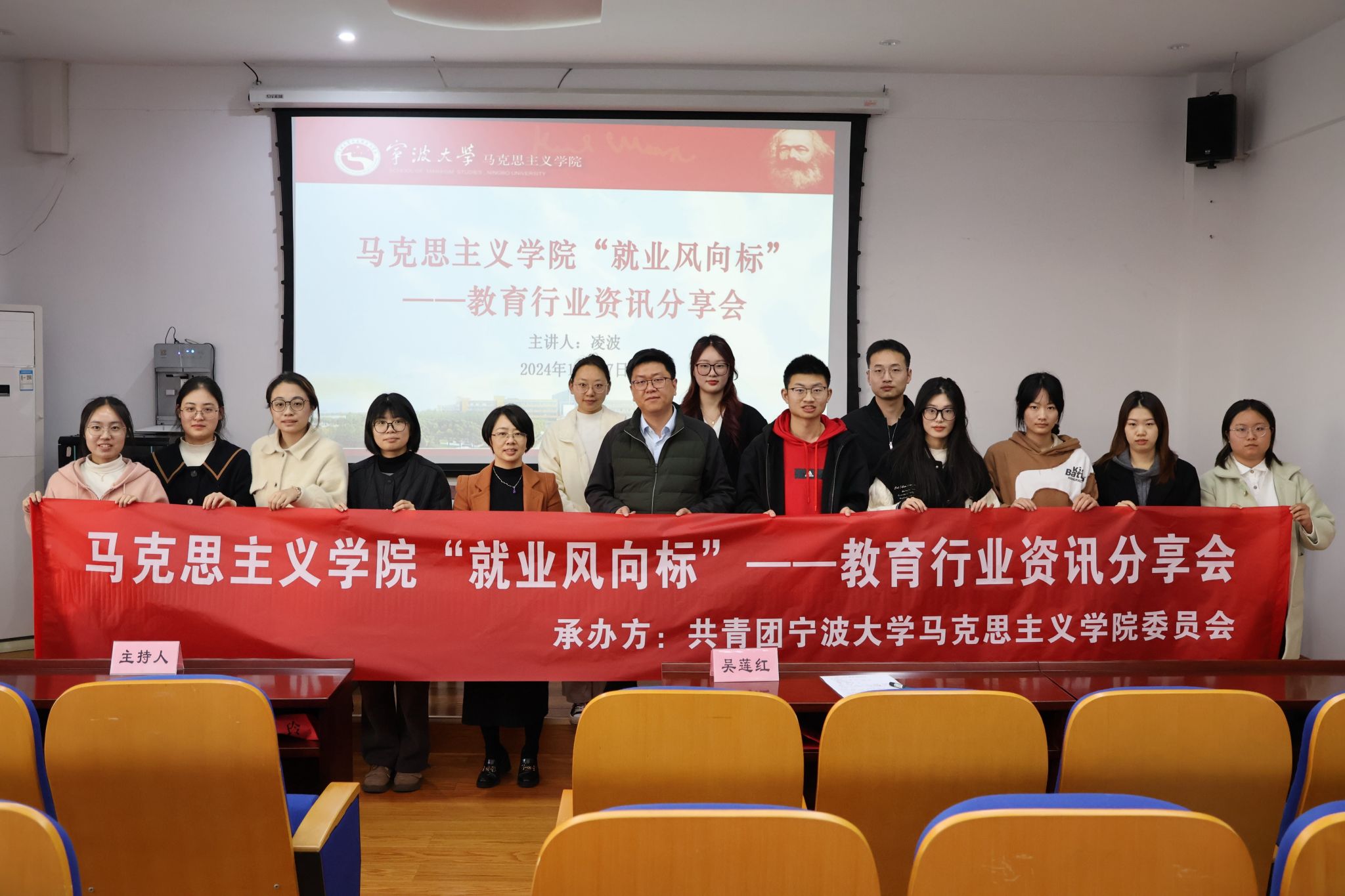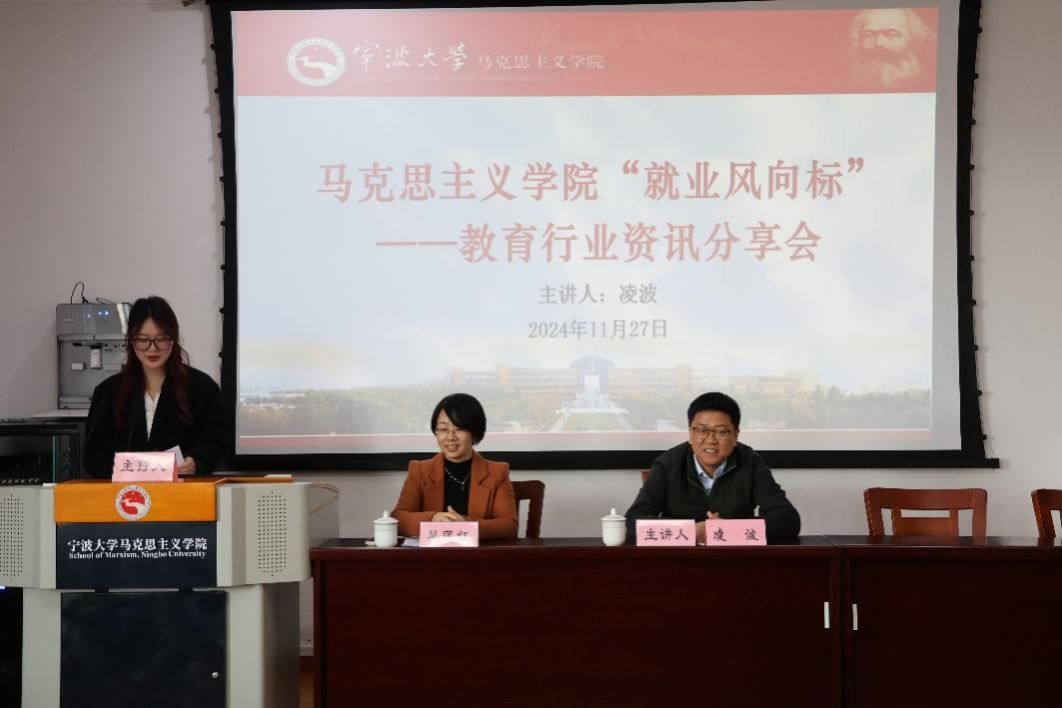 11月27日下午,马克思主义学院“就业风向标”——教育行业资讯分享会在包玉书科学楼7-406会议室举办。活动特邀宁波市教育考试院副院长凌波作咨询分享,院党委副书记吴莲红出席,就业辅导员曹慧娟主持,本研共100余名学生参加。
