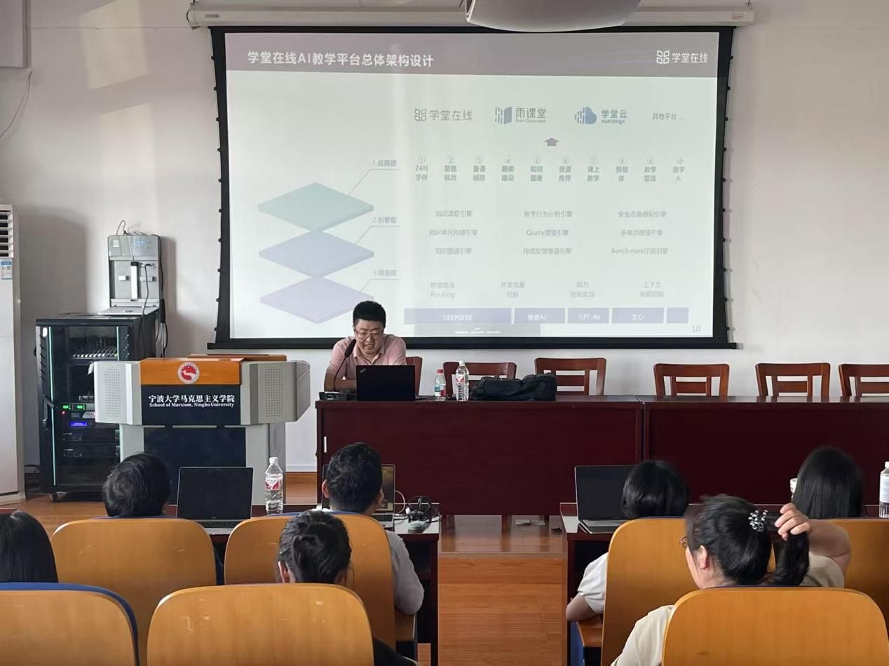 5月14日下午,在马克思主义学院7-406教室内,一场以"生成式人工智能技术驱动教学创新"为主题的实战工作坊如期举行。学院邀请学堂在线技术专家通过理论讲解、平台演示与案例剖析,重点展示了AI技术在教学全流程中的创新应用,我院教师二十多人齐聚一堂,共同学习。