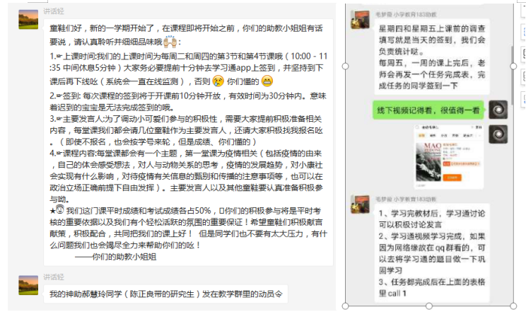 班助是课堂气氛的神推手。助教以学生大哥哥大姐姐身份沟通交流,更加贴近学生,拉近了师生之间的距离。《毛泽东思想和中国特色社会主义体系概论》课姜华庆老师的线上第一堂思政课,研究生助教郝慧玲协助姜教师展开课前动员、课内微信讨论、维持课堂秩序、学生冷场的处理及学习积极性和内容的统计等工作。特别是郝慧玲的“网络动员令”语言生动,受到同学们的欢迎:“童鞋们好,新的一学期开始了,在课程即将开始之前,你们的助教小姐姐有话要说,请认真聆听并细细品味哦:....,有什么问题我们也会竭尽全力来帮助你们的吆!——你们的助教小姐姐”,学生点赞无数,线上互动交流踊跃,线上教学出现良好的秩序。助教的每一条温馨提示,同学们响应如潮。“学习通视频学习完成后,如果因为网络缘故在QQ群中看的,记得去学习通里把题目做一下,巩固下学习...”“线下视频很值得一看,各位学妹学弟不要错过呦”...等等,这些网络告知书有条有理,像个邻家大姐姐的话语,赢得了同学们的喜爱和接受,一下子有了亲近感。2018级中法旅游管理专业本科生辛佳颖“在老师和助教的带动下,第一堂思政网课很生动,整堂课气氛活跃,完全没有隔着屏幕的疏远感。”