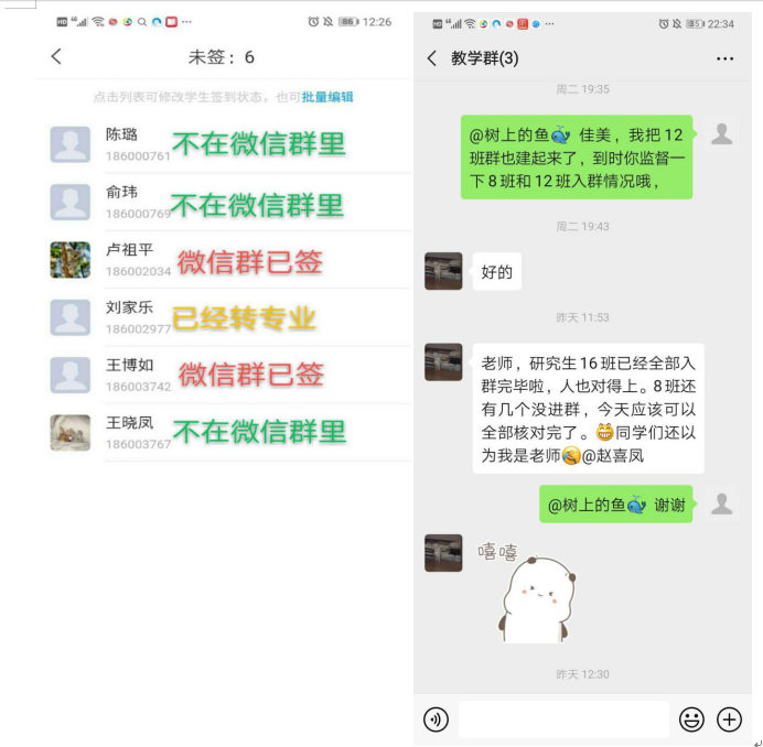 班助是线上签到的大管家。有了班助,老师就可以按课表按时上课,对于未及时上线的,班助在场外点对点提醒学生,把不能实时在线的学生情况和原因进行记录,作为平时考勤依据。鲍展斌老师说:“网上课堂到课率也是我在网络授课时考虑的一个重点。面对《马克思主义基本原理概论》课100多人的大班,我一边上课一边管没有及时上线的学生,容易手忙脚乱,我动员研究生助教戴莉婷同学参与网上班级管理,帮我解决了一些后顾之忧。”《毛泽东思想和中国特色社会主义体系概论》课王立衡老师说,“第一周上了两次课,班级99个学生全部在线,多亏有助教在旁协助打卡等事务,上起课来轻松了许多”。除个别学籍异动的学生联系困难之外,全校思政课这一周学生实时到课率达到100%,这在日常课堂教学都难以做到。
