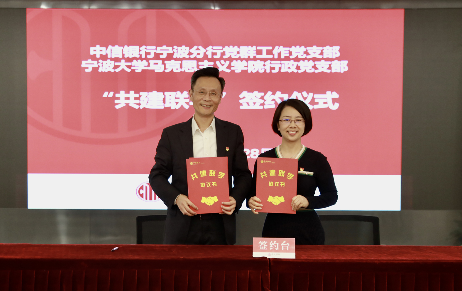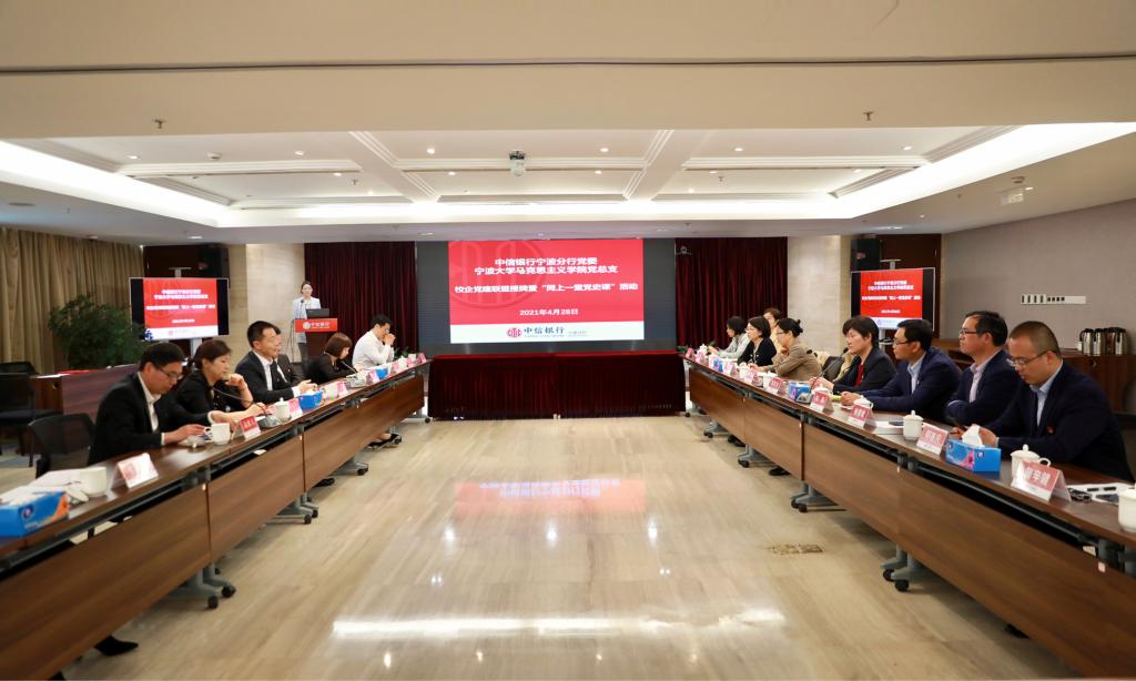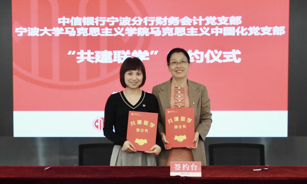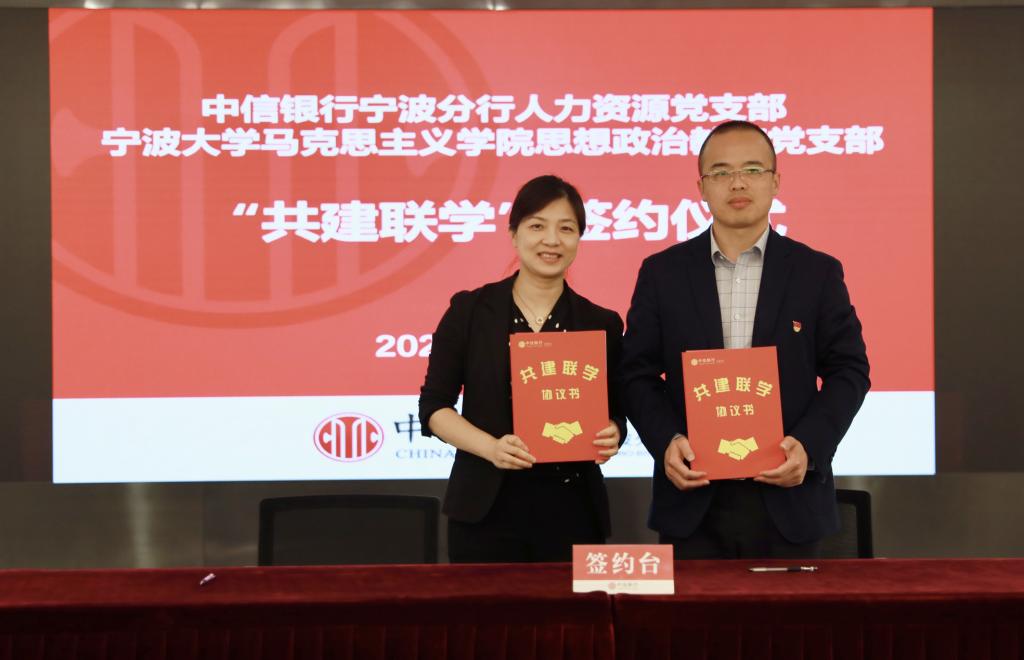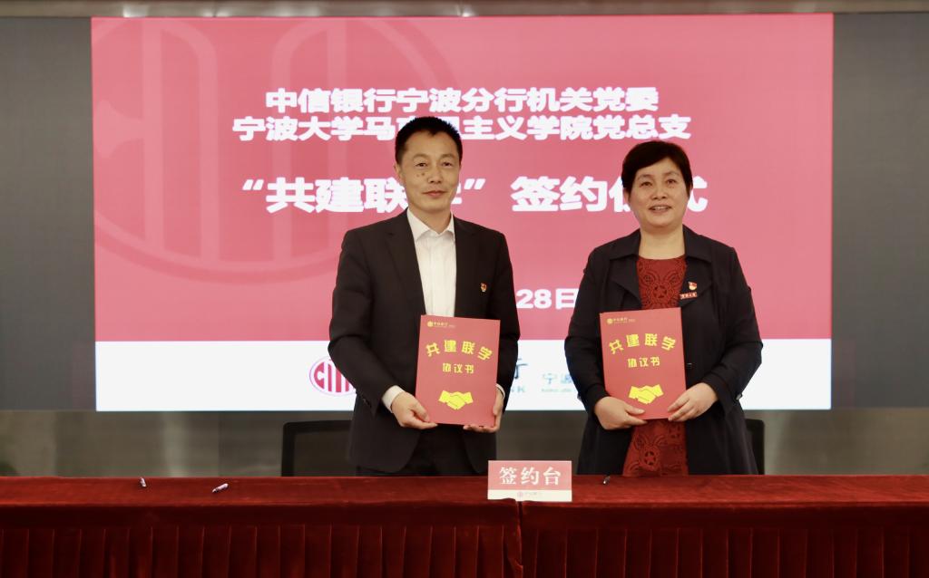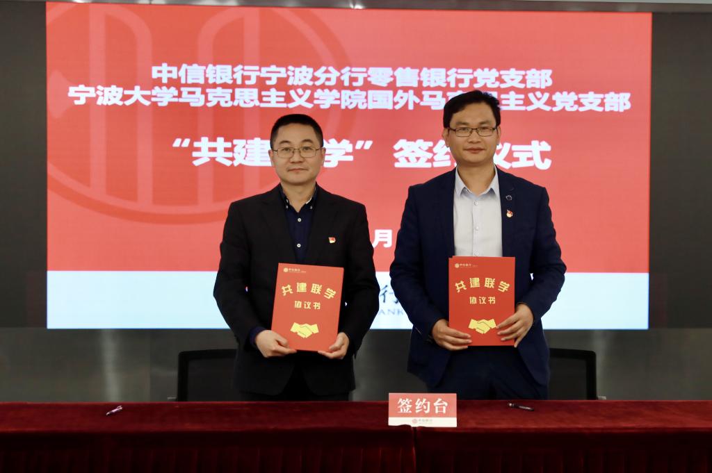 为深入开展党史学习教育,激发高校基层党建工作活力,探索校企党建共建融合式发展新模式,宁波大学马克思主义学院党总支与中信银行宁波分行决定建立校企党建联盟。4月28日,在中信银行宁波分行会议室,学院党总支与中信银行宁波分行机关党委共建签约,校企双方负责人为党建联盟授牌。同时,行政党支部、马克思主义基本原理党支部、马克思主义中国化研究党支部、思想政治教育党支部、国外马克思主义研究党支部分别与党群工作党支部、高新支行党支部、财务会计党支部、人力资源党支部、零售银行党支部等5个党支部签署“共建联学”二级协议。中信银行宁波分行党委委员、纪委书记、机关党委书记王立民、党委宣传部部长姚小荣出席了会议。